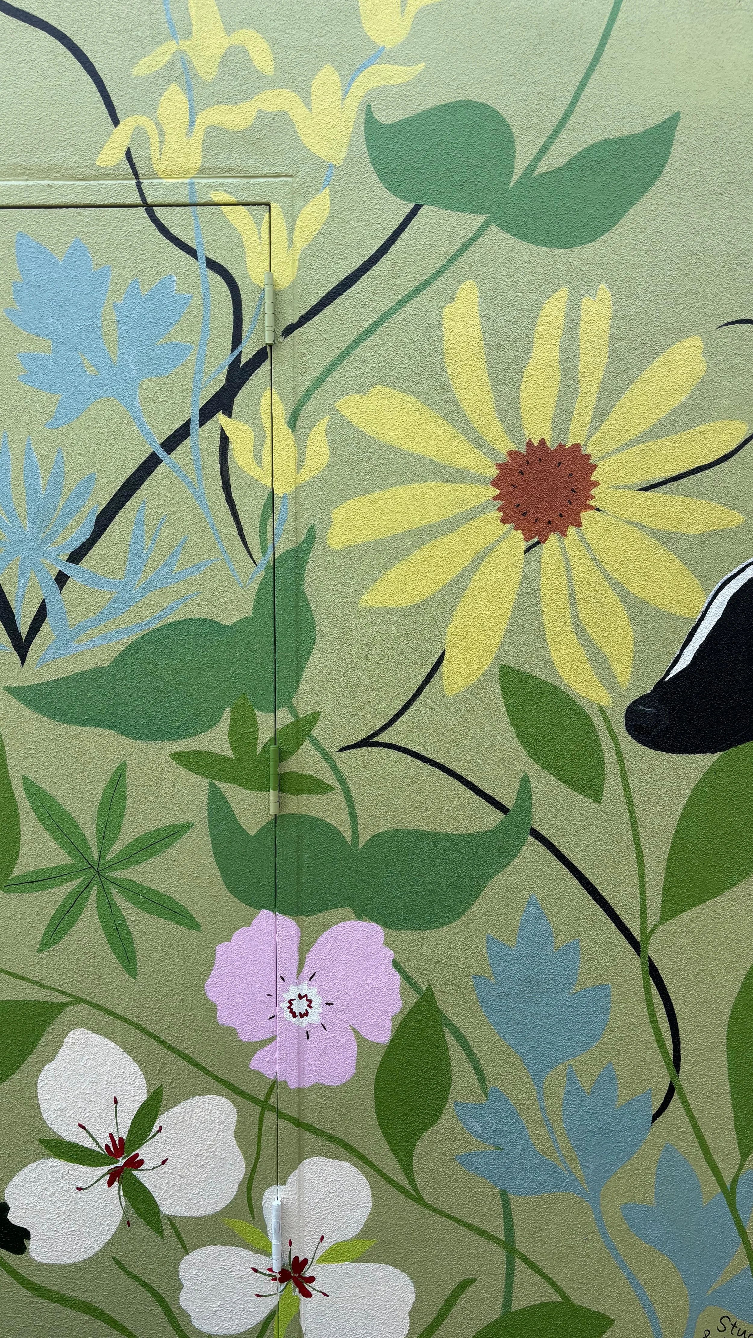 Inside the facility we painted a pair of murals that visually tie to the illustrated guardrail, creating a sense of cohesion throughout the space. The painted imagery broadens the context of our monarch narrative to include the nearby river and downtown neighborhood in which the medical facility is located.
